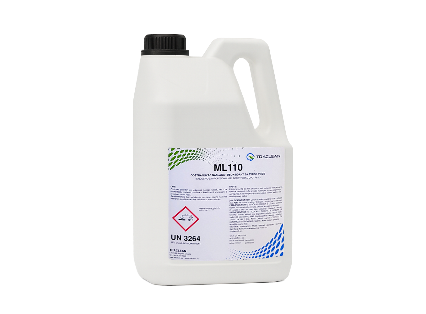 ML-110 is a professional product designed for removing calcium deposits and deoxidizing metal surfaces. It can be used by immersion or flushing with a flow of hard water. The formula contains inhibitors that prevent damage to treated surfaces when used in recommended concentrations. It is suitable for professional and industrial use, especially in applications where effective removal of scale or rust is required while ensuring protection of metal surfaces.